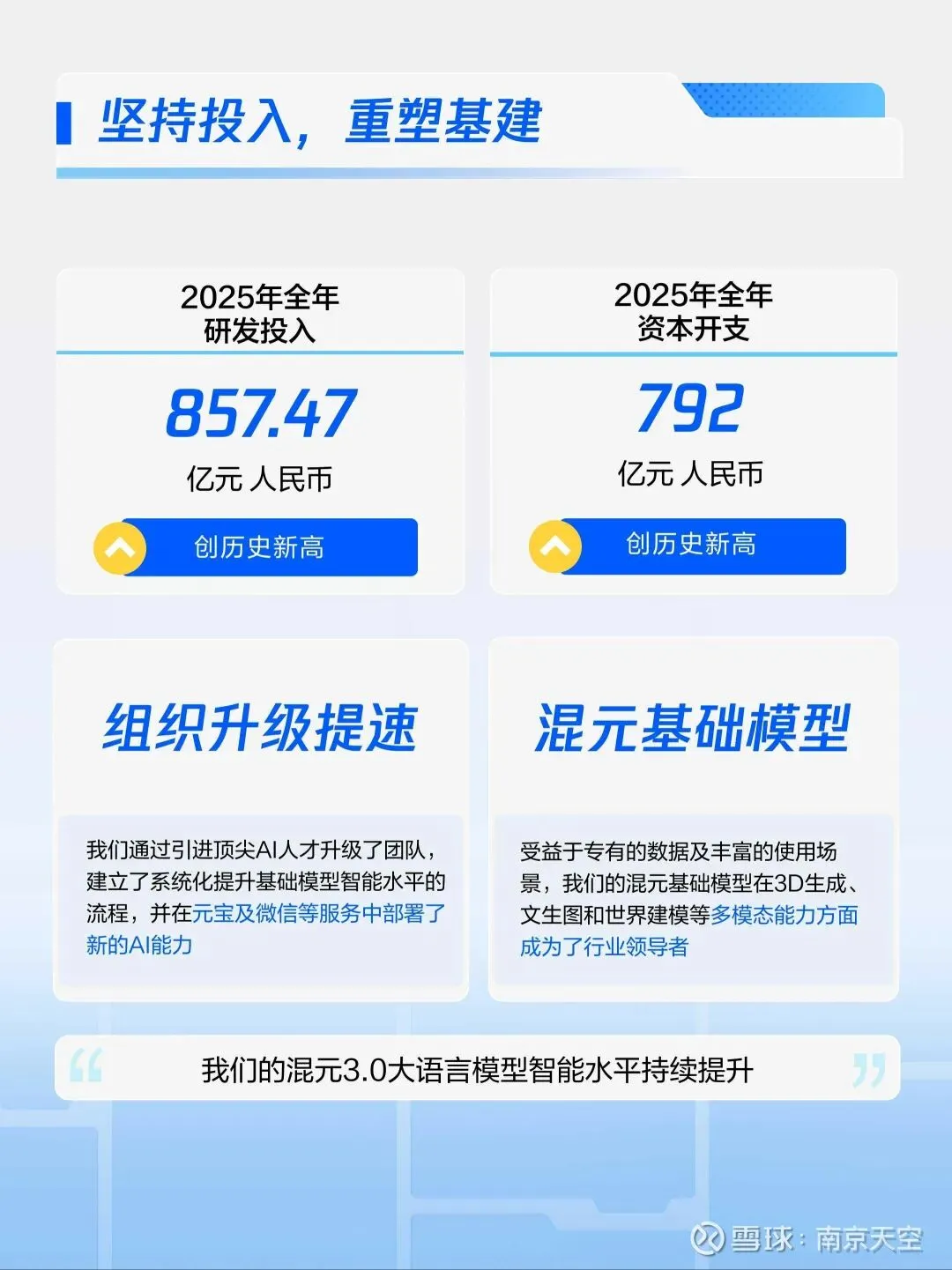 1、2025年,腾讯做出了一个极为清晰的决定:将AI提升为“唯一仍在‘提前烧钱’的战略”,并计划在2026年将约10%的收入(800-1000亿元)投入其中,甚至可能动态调整股东回报(如回购)以倾斜资源。公司进行了组织架构调整,合并了AI大模型和产品部门,以提升执行效率。这标志着AI从赋能工具升级为决定未来十年的核心赌注。