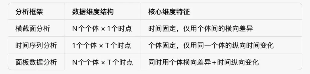 换句话说,你能拿到的任何用于实证分析的结构化数据,都必然属于这三类中的一种,这也是它们能成为“主流基础框架”的核心前提:
