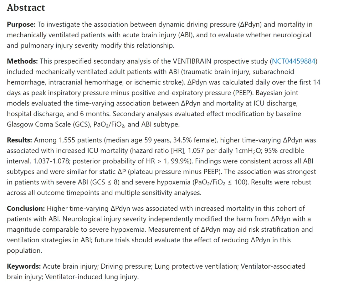 Taran S, Citerio G, Taccone FS, et al. Dynamic driving pressure and clinical outcomes in mechanically ventilated patients with acute brain injury: a secondary analysis of the VENTIBRAIN study. Intensive Care Med. 2026;52(1):31-41. doi:10.1007/s00134-025-08241-0.摘要
