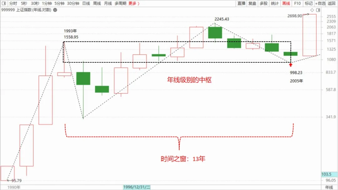 本节课中缠师提了一个二三类买点重合的案例,参照的中枢是三十分钟,那么在五分钟上应该是三段走势类型,没有当时的分时图,只能在日线图上画了,个人参照零师K线重叠理论画,如下图:8、文中缠师提到了年线的方向。“上海的年线图就可以看到,从1992年到2005年,一个完美的年级别缠中说禅中枢的三段次级别走势完成,时间刚好是13年,一个完美的时间之窗。站在年线的角度,中国股市的真正大牛市才真正开始,因为该中枢是中国股市的第一个年中枢,区间在998到1558点。”如下图: