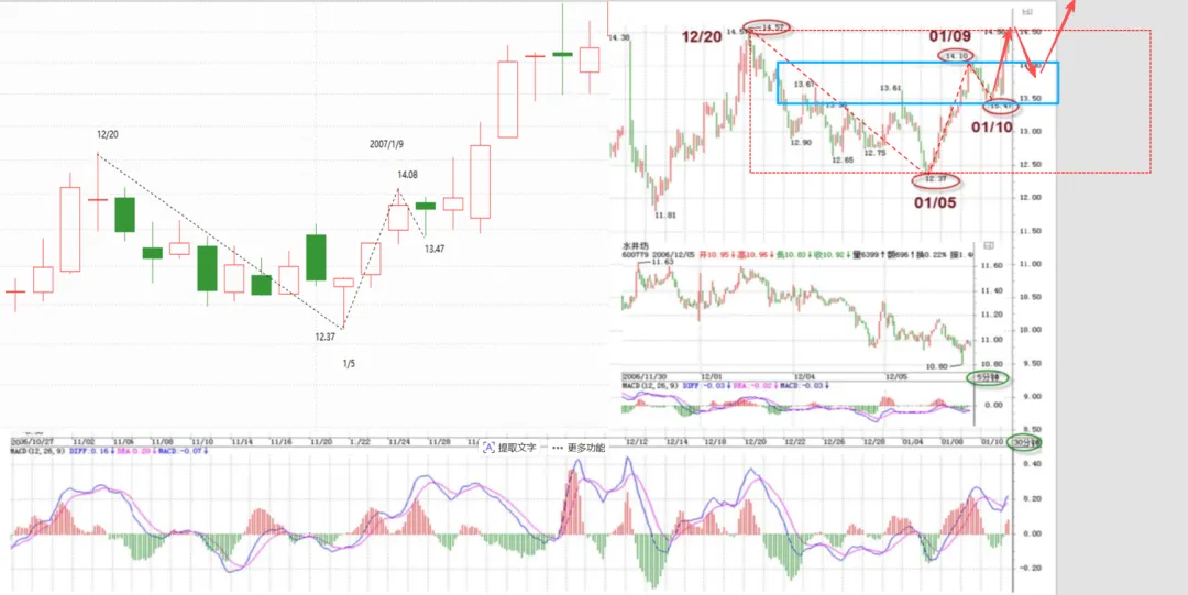 注:中枢形态的交替原则,使用在趋势中,缠师这里没讲,但从字面意思来理解,是相邻两个中枢的形态往往不一样。从缠师分析的实例上来看,因该是如下图所示的两处不同中枢:问:2、600779从30分钟图看,12月20日14.58-1月05日12.37为第一段下跌走势,然后到1月9日14.08为第二段上涨走势,到1月10日13.47为第二段下跌走势,已经有连续三个走势,完成一个中枢(13.47-14.08),接下来继续可能会是一个扩张或新生。