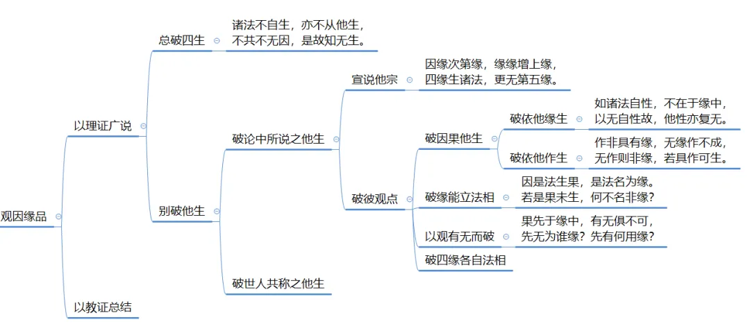 破他生科判分四个方面,破因果他性、破自性的因存在、观察果之先后以及破四缘各自法相。本颂词是破因果的他性。