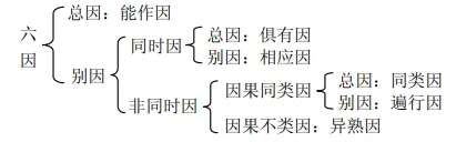 有部宗六因的分类如下图所示,可以分类为总因和别因,能作因为总因,别因又可分为同时因和非同时因。俱有因和相应因为同时因,而相应因又是俱有因之分支。非同时因可以分为因果同类和因果不同类。同类因和遍行因为因果同类,而遍行因则是同类因之分支,异熟因为因果不同类。下面对每一个因作简单解释,详细可参考《俱舍论》第二品。