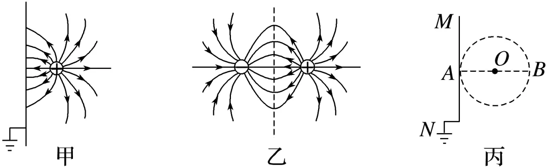 8.经过探究,某同学发现:点电荷和无限大的接地金属平板间的电场(如图甲所示),与等量异种点电荷之间的电场分布(如图乙所示)相同,图丙中固定于O点的正点电荷q到金属板MN的距离OA为L,AB是以点电荷q为圆心、L为半径的圆上的一条直径,静电力常量为k,则B点电场强度的大小是( )