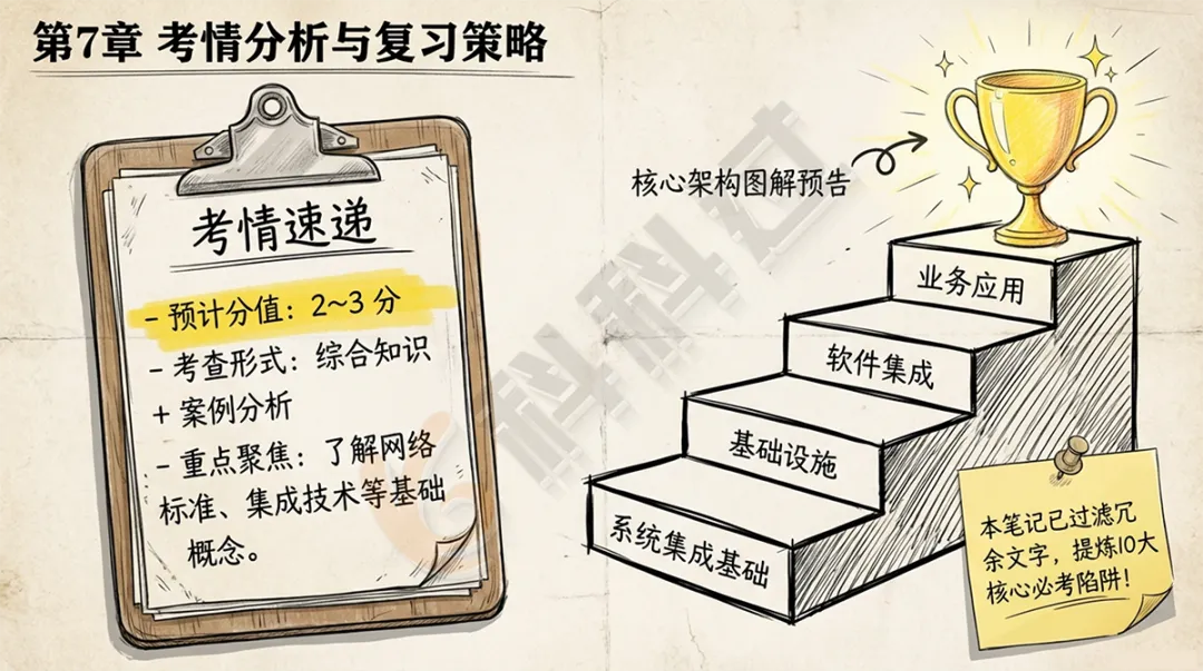 根据最新三年考试大纲及趋势分析,本章节 “第7章:软硬件系统集成” 在2024下半年至2025上半年(新大纲稳定期)的考查占分为 2~3 分。考查形式包含综合知识+案例分析。趋势分析指出,本章的重点内容主要集中在了解网络标准、集成技术等基础概念。