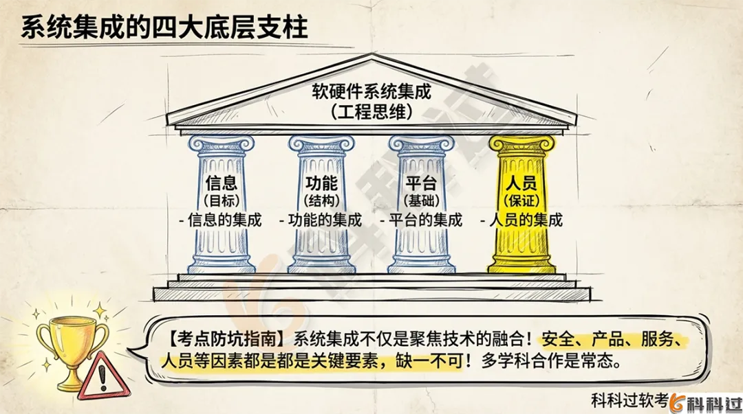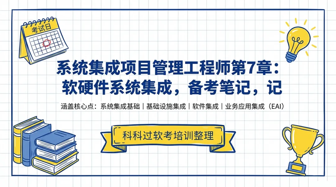 【核心内容摘要】本章系统介绍了软硬件系统集成的基础理论与核心技术。主要内容涵盖:系统集成基础(系统集成的概念、典型项目特点、信创与系统集成发展);基础设施集成(弱电工程的10大常见子系统、网络集成的5大子系统、数据中心机柜/服务器/存储/网络/安全设备的集成);软件集成(操作系统、分布式数据库、6类中间件的划分、流式与版式办公软件、应用软件集成的SOA架构及CORBA/COM/J2EE/.NET标准);业务应用集成(EAI的概念、技术要求、优势与工作原理)。