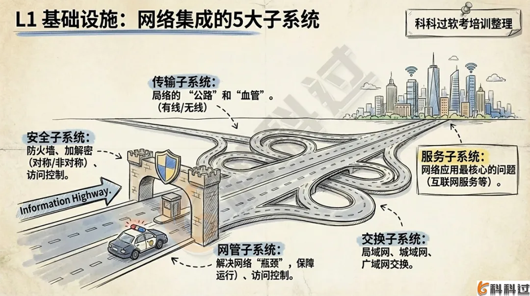 - 网络集成的5个子系统(传输、交换、安全、网管、服务)
