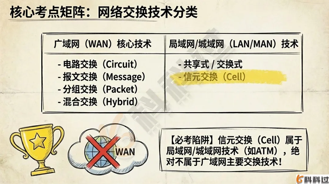 详细解析:广域网的主要技术包括:电路交换、报文交换、分组交换、混合交换。信元(更小的数据单元)为交换单位的硬件交换通常应用于局域网或城域网(如ATM在城域网的应用),不在教材定义的广域网四大核心交换技术之列。