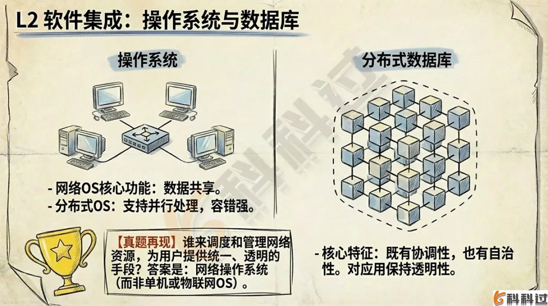| 操作系统 | 分为桌面、服务器、手机、嵌入式等。网络操作系统核心功能是数据共享;分布式操作系统特点是资源分布于不同计算机,支持并行处理,容错能力强 |