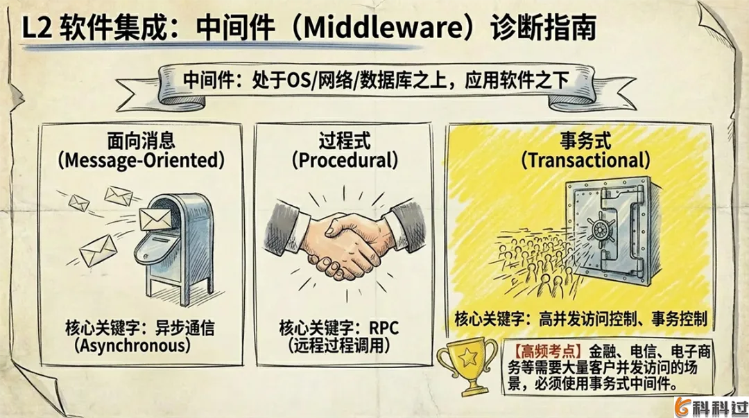 详细解析:事务式中间件主要提供联机事务处理所需的通信、并发访问控制、事务控制等服务,支持大量客户进程并发访问,扩展性极强,主要应用于金融、电信等领域。