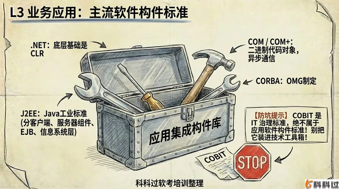 详细解析:在软件集成大背景下出现的有代表性的软件构件标准包括:CORBA、COM、DCOM与COM+、.NET、J2EE应用架构等标准。COBIT(信息及相关技术的控制目标)通常是IT治理标准,不属于应用软件构件标准。
