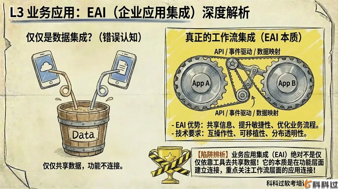 详细解析:选项B描述错误。教材指出,业务应用集成 “不同于数据集成”,数据集成是共享数据并不存储数据;而业务应用集成是 “在功能层面将多个业务应用直接连接起来”,重点关注的是工作流层面的应用连接。