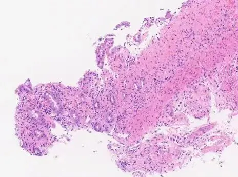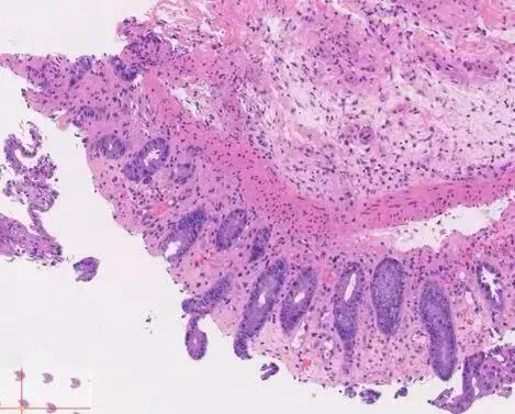 图2:缺血性结肠炎:黏膜表层损伤,固有层玻璃样变,隐窝萎缩,残余腺体排列密集