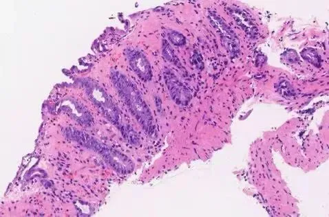图3:缺血性结肠炎:固有层玻璃样变,隐窝上皮呈非典型性改变:细胞核深染,核增大。