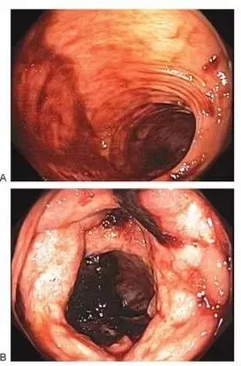 图4*:相关文献报道缺血性结肠炎内镜所见:A:轻度缺血性结肠炎:黏膜出血、红斑及腔内积血 B:重度缺血性结肠炎:溃疡、散在糜烂及腔内血凝块