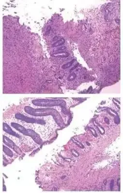 图1:缺血性肠炎:黏膜表层损伤(糜烂),隐窝黏液丢失,隐窝萎缩