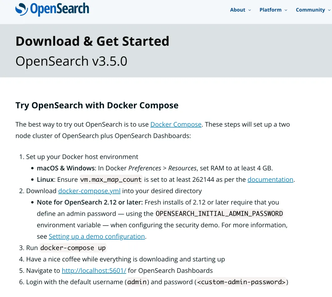 官方提供了Docker Compose示例,我这里选择的是3.x版本进行安装。需要特别注意的是,从OpenSearch 2.12开始,必须通过OPENSEARCH_INITIAL_ADMIN_PASSWORD这个环境变量来指定初始管理员密码。