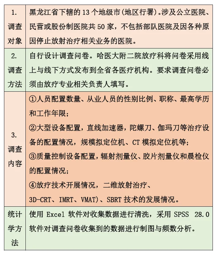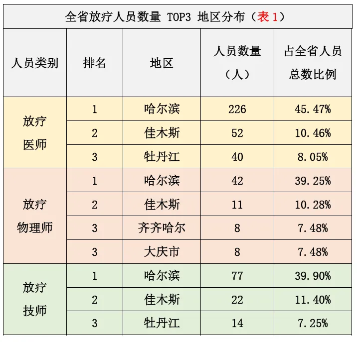 本次调查范围涵盖黑龙江省(除部队医院外)所有具备肿瘤放射治疗的医疗机构,调查结果显示,在人员结构、从业年限、地区资源配置上均有较大的向上改动空间。