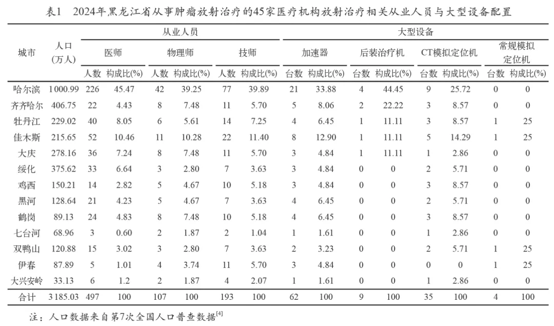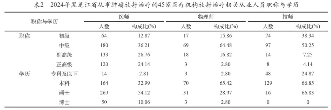 文献来源:魏子钰,李文慧,崔岳,等.黑龙江省45家医疗机构肿瘤放射治疗设备与人员配置现状调查分析[J].中国医学装备,2026,23(02):85-88+93.