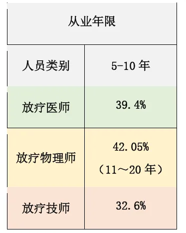 ②从业年限方面,近5年来放射治疗医师与物理师新入职从业人员较少,可能有较大就业空间,从业年限<5年的技师占相关从业人员总人数26.42%,提示近5年来放射治疗技师从业人员呈年轻化趋势;