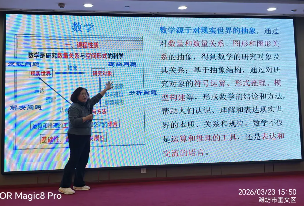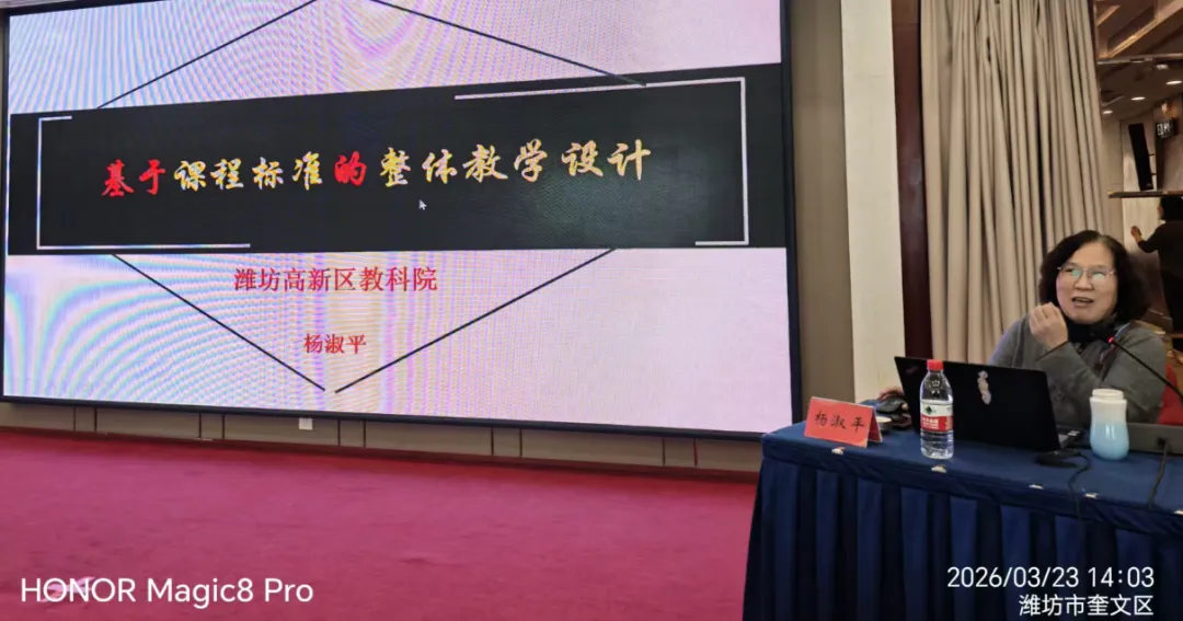 杨院长首先欢迎了来自佛山的老师们,并点明了本次讲座的主题——《基于课程标准的整体教学设计》。她强调,无论教学形式如何变化,最终都要指向课程标准的目标。因此,第一个关键词是“基于课程标准的”,第二个关键词是“整体教学设计”。