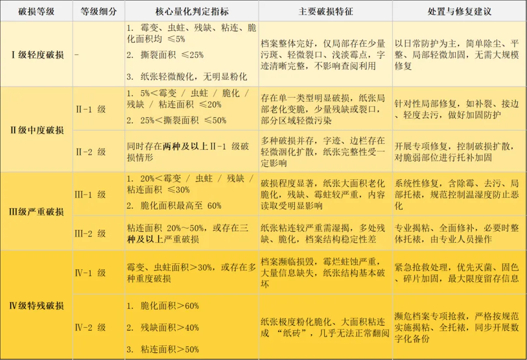 GB/T 42468.1-2023将纸质档案破损等级划分为轻度破损、中度破损、严重破损、特残破损四个等级,每个等级均明确了具体的定级指标,结合实际修复工作中的实操经验,整理如下(参考标准核心条款及行业应用案例):