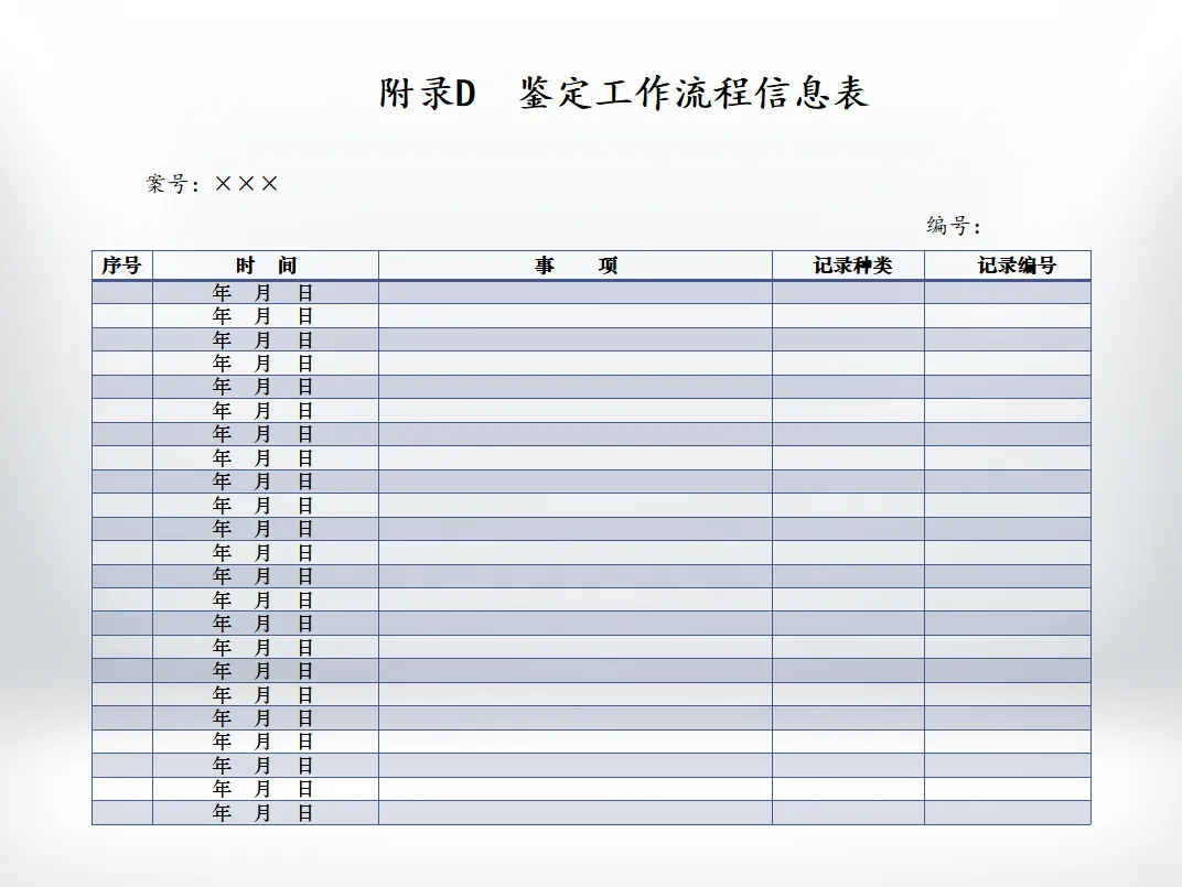 3.鉴定人应建立《鉴定工作流程信息表》,将鉴定过程中每一事项发生的时间、事由、形成等进行完整的记录,并进行唯一性、连续性标识。