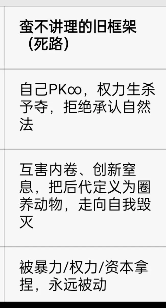 维度 蛮不讲理的旧框架(死路) 讲道理的新框架(活路)