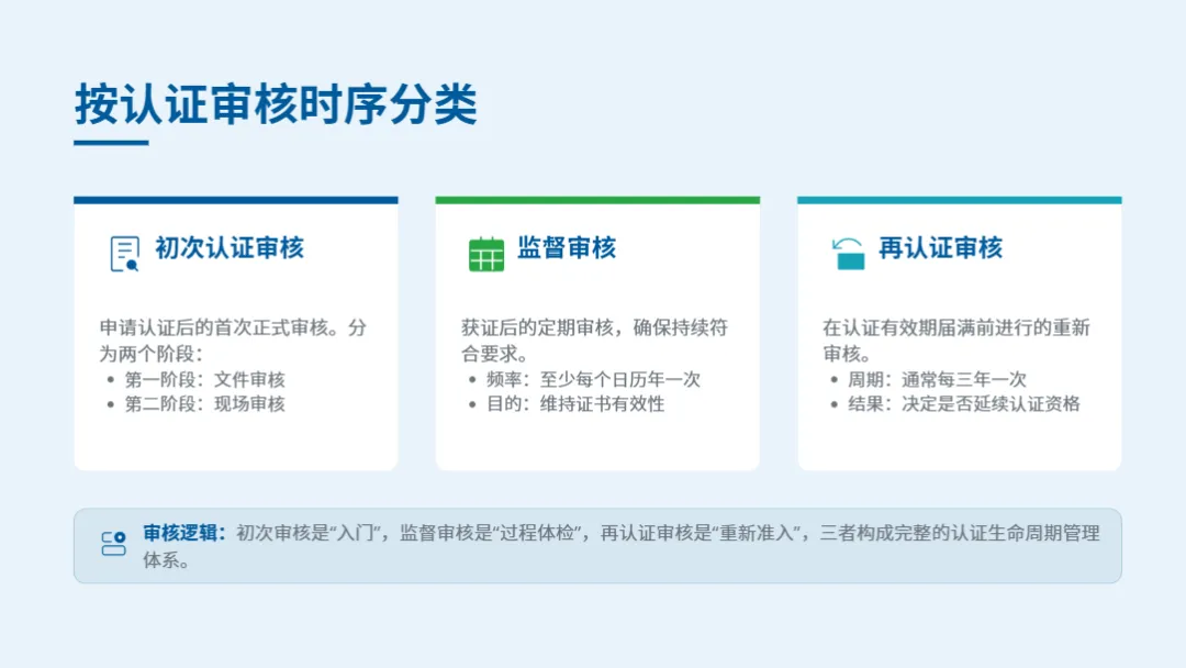 初次认证审核:两阶段——文件审核 + 现场审核监督审核:至少每个日历年一次,维持证书有效性再认证审核:每三年一次,决定是否延续资格