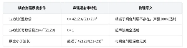 1/4 波长奇数倍:当耦合剂层厚度等于 1/4 耦合剂波长的奇数倍,且耦合剂层声阻抗等于根号下 Z1 乘以 Z3 时,声强透射率等于 1,超声波完全透射。