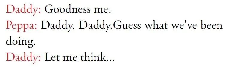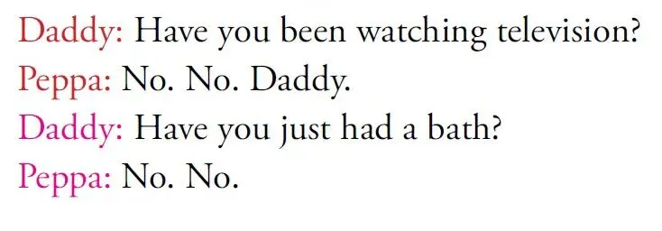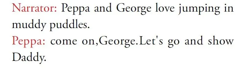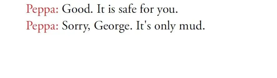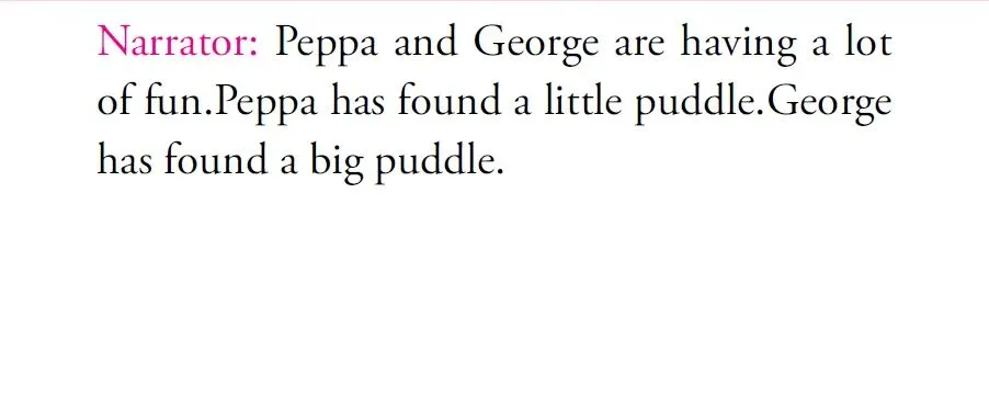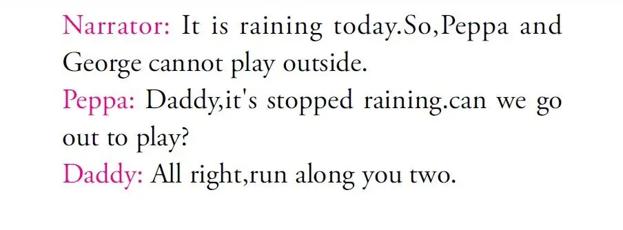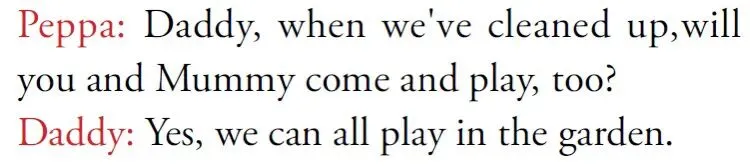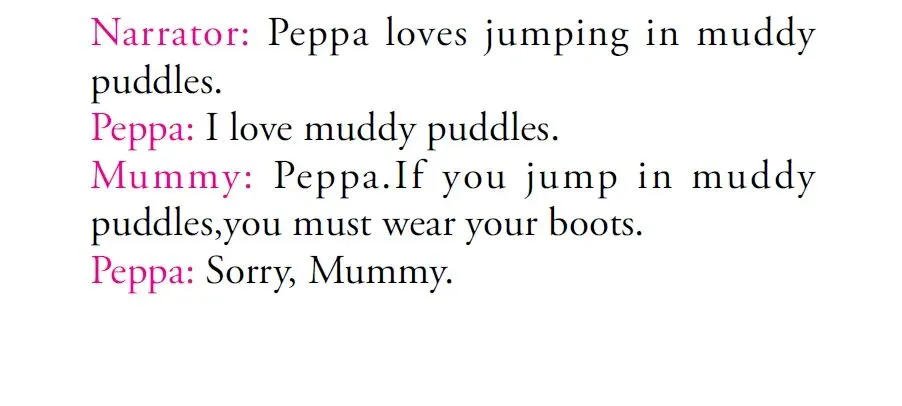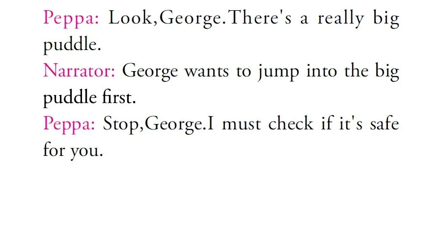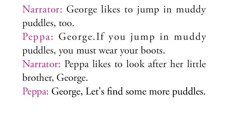 例:Peppa likes to look after her little brother, George. Peppa 喜照顾她的弟弟,乔治。