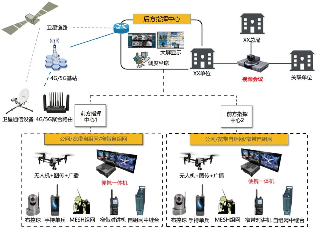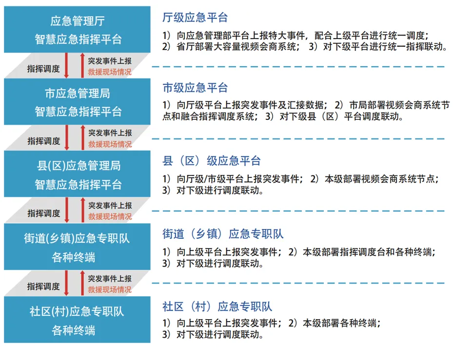 应急指挥五级联动,以应急指挥信息网为骨干、互联网为补充,按照“三级部署五级联动、专公互联、视频可达”的总体思路开展建设。省厅基于应急指挥信息网和“云”各部署一套通信服务中台,基于应急指挥网部署的
