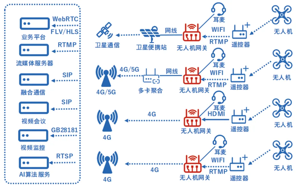 多功能无人机现场推流网关是一款小型化的网关产品,内置了无人机推流服务器,支持无人机以 RTSP , RTMP ,GB/T28181 ,HDMI等方式进行现场推流,并根据需要对视频进行编码格式调整,视频分辨率,帧率,码率的调整。可上行推流到视频会议,融合通信,视频监控,应急指挥,分布式大屏,流媒体平台等环境。内置全网通4G上网模块,WIFI-AP能力,千兆网口,满足多种无人机现场推流方式。可背包式应用,可桌面应用,应用展开更灵活。