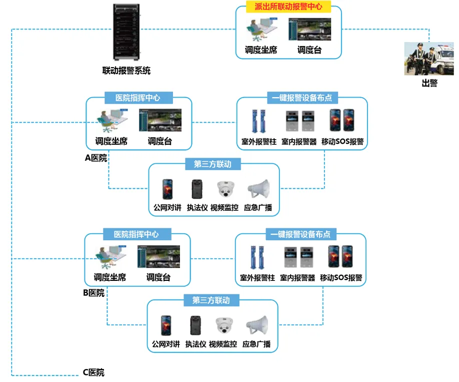 医院、学校、园区应急联动:在医院急诊室、诊疗室、医生办公室、护士站、住院部、洗手间、饭堂等重点区域安装相应的一键报警设备,室外安装可视报警柱,尽可能做到公共区域全局覆盖,便于医护人员报警求助。一键联网报警系统具备电子地图定位、可视语音对讲、监听监视、智能广播及主动广播、视频门禁联动、公安110对接联动等功能。一旦发生突发事件、群体闹事等应急事件时,只要按下报警设备上的报警按钮,报警信息立即上报到管理中心,可同步启动上级管理中心或110报警对接,就近出警,以最快速度赶到现场,尽量避免重大伤亡事件发生。