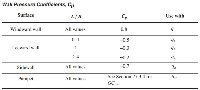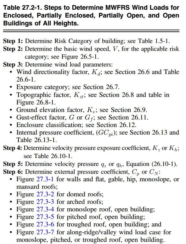 27的两个最主要的内容,就是如何计算封闭、部分封闭和部分开放建筑的风荷载27.3.1节(Enclosed, Partially Enclosed, and Partially Open Buildings and Flexible Buildings)和开放建筑的风荷载27.3.2节(Open Buildings)。