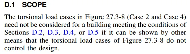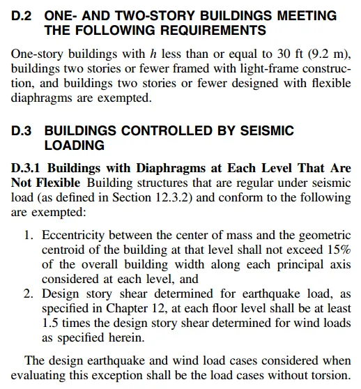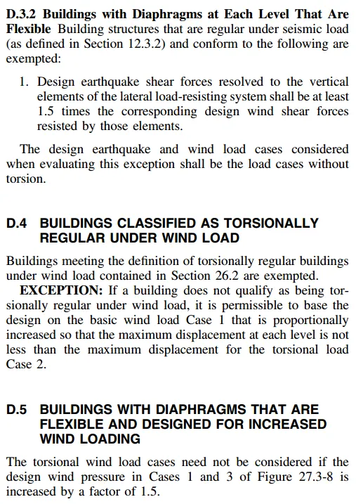 | D.2 - 低矮建筑豁免(最常用)条件:单层建筑,高度 h≤9.2m (30ft);或两层及以下轻建筑;或两层及以下采用柔性隔板(Flexible Diaphragm)的建筑 工程意义:低矮建筑风荷载小,扭转效应不敏感;柔性隔板(如你的檩条屋面)允许变形协调,会自然释放扭矩。 D.3 - 地震控制豁免 条件(需同时满足):建筑在地震作用下是"规则"的(Regular,见12.3.2节)每层地震剪力 ≥1.5 倍该层风剪力 工程意义:如果地震比风大很多(1.5倍以上),即使考虑风扭转,也不会控制设计,因此可以豁免。 D.4 - 扭转规则建筑豁免 条件:建筑满足"风荷载下扭转规则"(Torsionally Regular under Wind Load)的定义(见26.2节)工程意义:质量和刚度分布高度对称的建筑(如正方形平面、均匀布置的抗侧力构件),天然抵抗扭转,无需额外考虑。 D.5 - 柔性隔板 + 增大风压条件:采用柔性隔板(Flexible Diaphragm)设计风压(Case 1 和 Case 3)放大 1.5倍 工程意义:用增大静力荷载的方式包络扭转效应,适用于无法精确计算扭矩但隔板柔性较大的情况(如檩条屋面)。 |