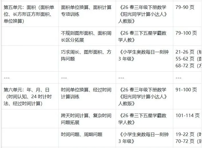 它给我生成了一张学习对应表,把课本的每一个单元、每一课时,跟三本教辅书的对应页码全部整理出来了。