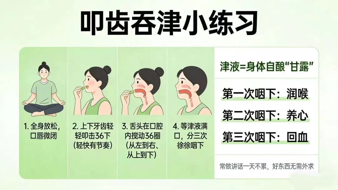 叩齿吞津,把津液留给自己,口干舌燥、嗓子冒烟的时候,与其狂喝水,不如试试这个小动作。