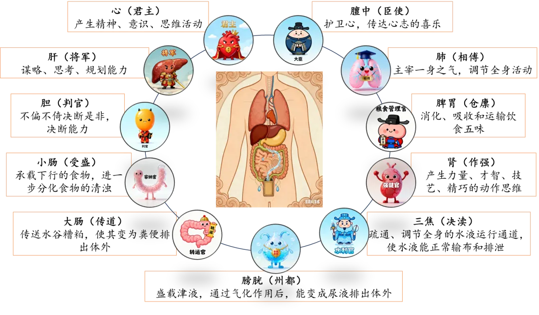 心者,君主之官也,神明出焉。肺者,相傅之官,治节出焉。肝者,将军之官,谋虑出焉。胆者,中正之官,决断出焉。膻中者,臣使之官,喜乐出焉。脾胃者,仓廪之官,五味出焉。大肠者,传道之官,变化出焉。小肠者,受盛之官,化物出焉。肾者,作强之官,伎巧出焉。三焦者,决渎之官,水道出焉。膀胱者,州都之官,津液藏焉,气化则能出矣。