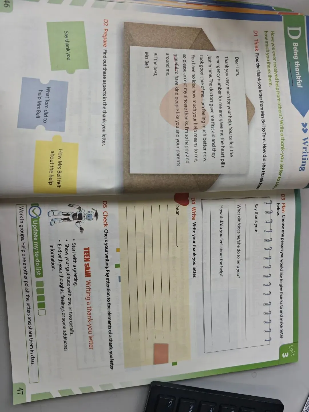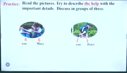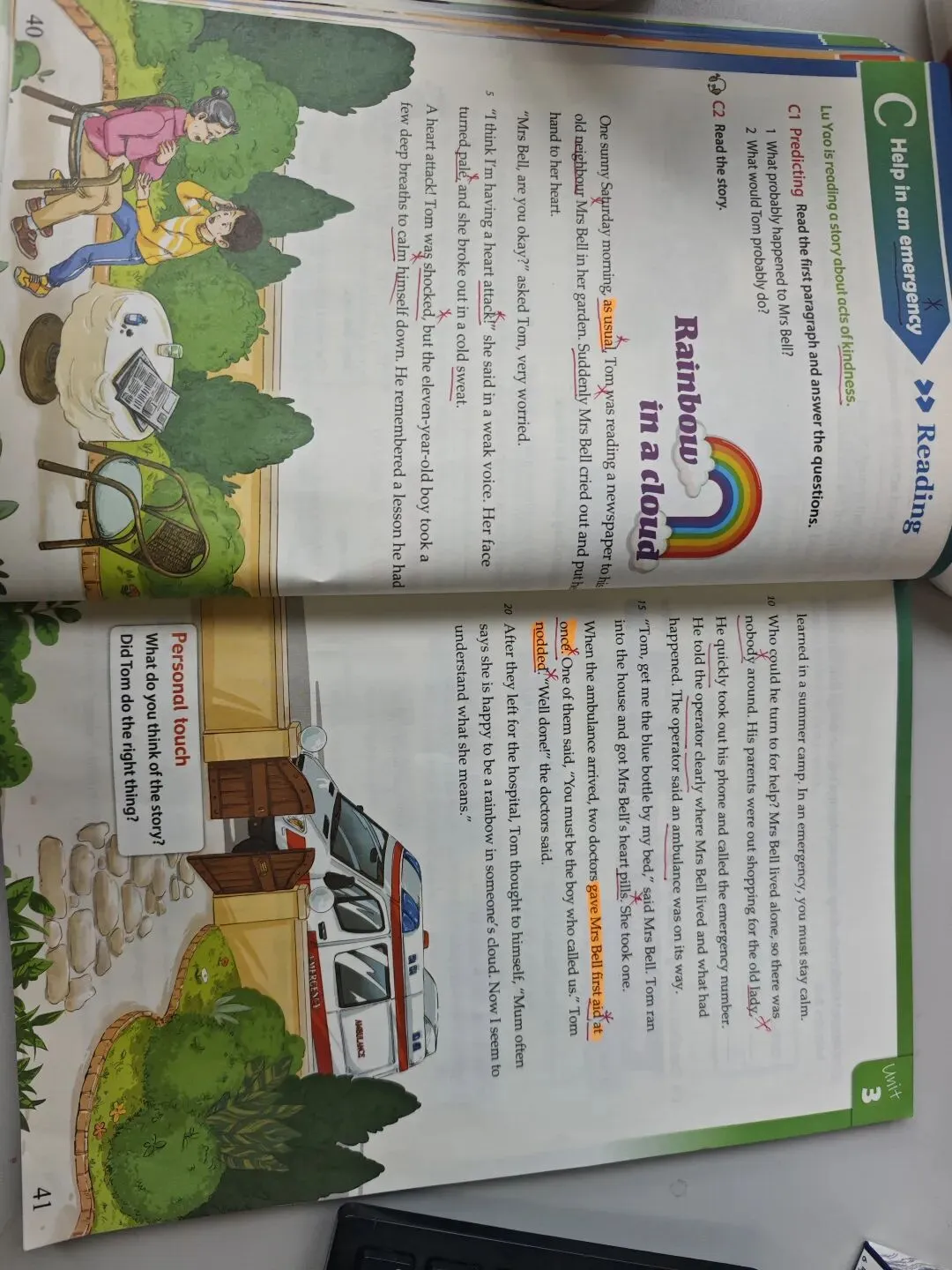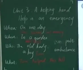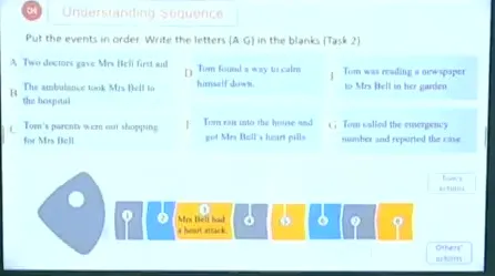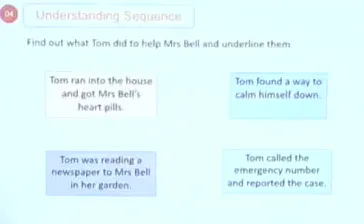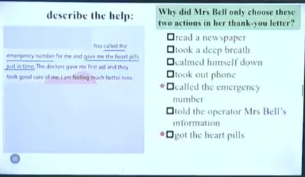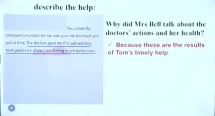 13:43 Underline Tom's actions to find out what Tom did to help Mrs Bell。配图,让学生每个图片对应一个action。有药品,报纸,深呼吸和急救电话图片。
