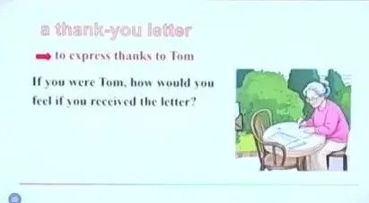 14:20 看图片 老奶奶写信,引出文体:a thank-you letter - to express thanks to Tom. How would you feel if you received the letter? happy,warm,moved