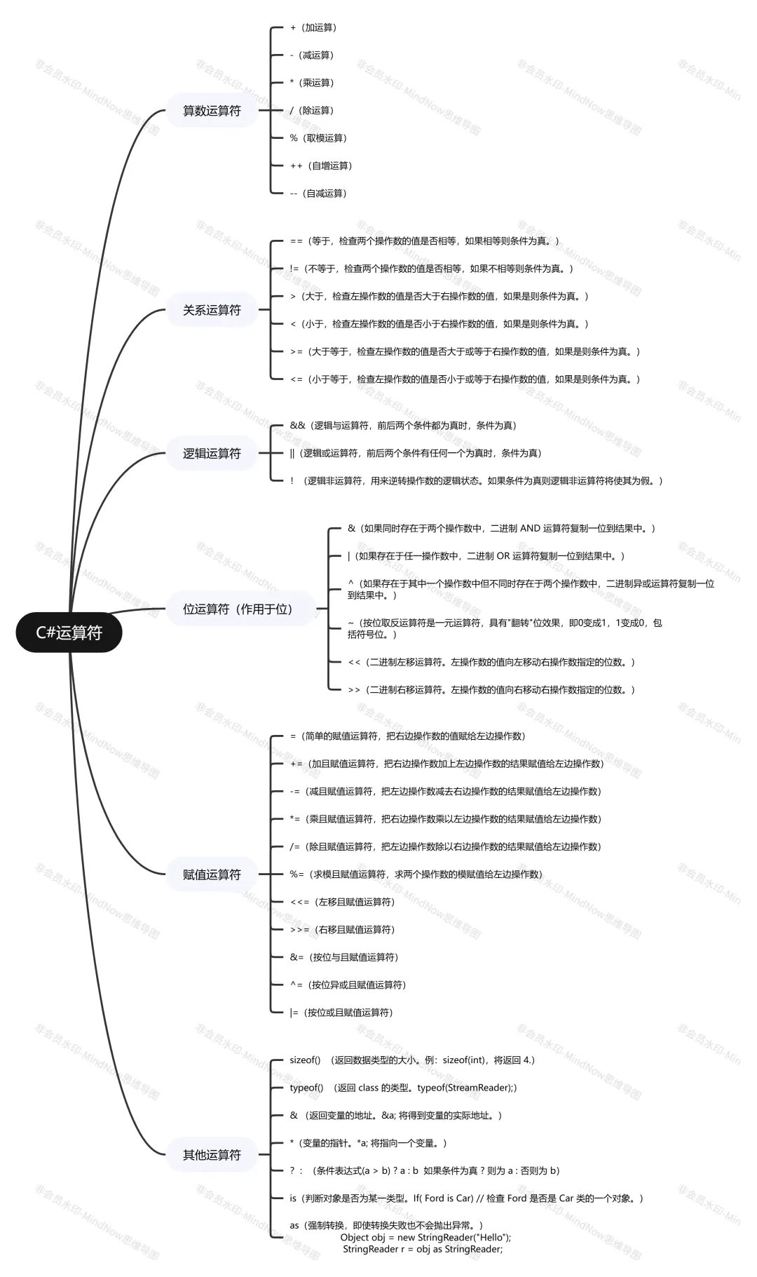 using System;namespace OperatorsAppl{ class Program { staticvoidMain(string[] args) { int a = 21; int c; c = a; Console.WriteLine("Line 1 - = c 的值 = {0}", c); c += a; Console.WriteLine("Line 2 - += c 的值 = {0}", c); c -= a; Console.WriteLine("Line 3 - -= c 的值 = {0}", c); c *= a; Console.WriteLine("Line 4 - *= c 的值 = {0}", c); c /= a; Console.WriteLine("Line 5 - /= c 的值 = {0}", c); c = 200; c %= a; Console.WriteLine("Line 6 - %= c 的值 = {0}", c); c <<= 2; Console.WriteLine("Line 7 - <<= c 的值 = {0}", c); c >>= 2; Console.WriteLine("Line 8 - >>= c 的值 = {0}", c); c &= 2; Console.WriteLine("Line 9 - &= c 的值 = {0}", c); c ^= 2; Console.WriteLine("Line 10 - ^= c 的值 = {0}", c); c |= 2; Console.WriteLine("Line 11 - |= c 的值 = {0}", c); Console.ReadLine(); } }}