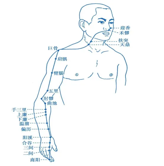 ·《灵枢•经脉》:大肠手阳明之脉,起于大指次指之端,循指上廉,出合谷两骨之间,上入两筋之中,循臂上廉,入肘外廉,上臑外前廉,上肩,出髃骨之前廉,上出于柱骨之会上,下入缺盆,络肺,下膈,属大肠;其支者,从缺盆上颈,贯颊,入下齿中,还出挟口,交人中、左之右,右之左,上挟鼻孔。