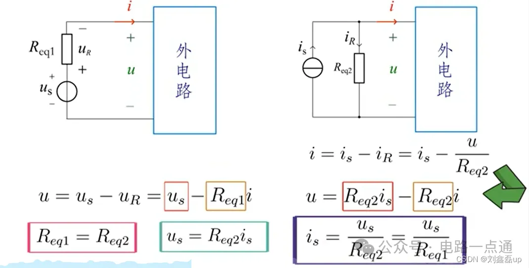 U = IR公式也可以看出来 实际电压源:理想电压源和电阻(内阻)串联 实际电流源:理想电流源和电阻(内阻)并联注意参数会变“通过KVL KCL计算:来改变电路结构 电压 和(串联) 电阻 = 电流 和(并联) 电阻