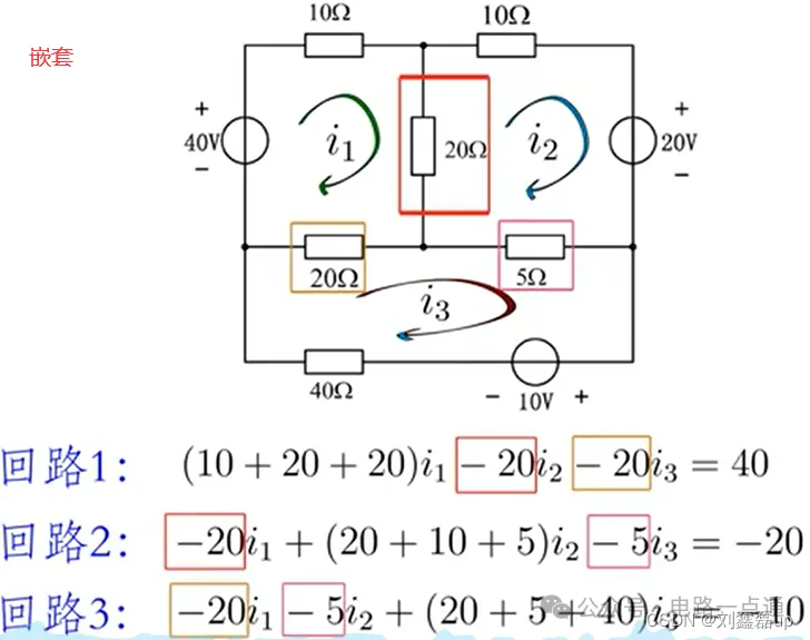 支路:每一个二端元件称为一条支路 多个二端元件串联(电流相等)可视为一条支路结点:支路与支路的连接点称为结点 多个等电位的结点可视为一个结点(中间没有阻挡)路径:从一个结点到另一个结点所经过的支路集合回路:从起点出发,终点又回到起点,所形成的闭合路径称为回路 要求中间经过的结点只能经过一次网孔:能令回路中不另外含有支路的回路称为网孔 网孔数量等于=KVL独立方程数,所以,判断KVL独立方程数的简单方法是数网孔数量 互阻(相同方向取正 相反取负):共同都在用 自阻(永远为正):自己独有的几个组合起来的 右端电源电压(非关联取+ 关联取-):等式右边的电压(根据网孔的不同而不同)