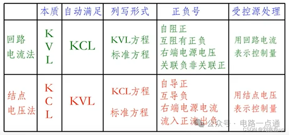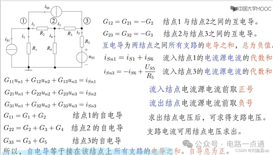 以结点电压为独立变量列写电路方程的分析方法 参考结点:任意选择某一结点 独立结点:除开参考结点外的其他结点 结点电压:独立结点与参考结点之间的电压【之间的电压 不是传统意义上的电压】 参考极性:以独立结点为正,参考结点为负结点电压法︰以结点电压为独立变量,列写独立结点的KCL方程,共有(n-1)个独立方程,称为结点电压方程 自电导 = 接在该点上所有支路的电导之和(没有阻挡 总为正) 互电导 = 两结点之间所有支路的电导之和(总为负值)G12 = G21 = -G2(结尾) 互电导因为结点之间没有电导流入结点 = 电流源电流的代数和 流入结点电流源电流前取正号 流出结点电流源电流前取负号