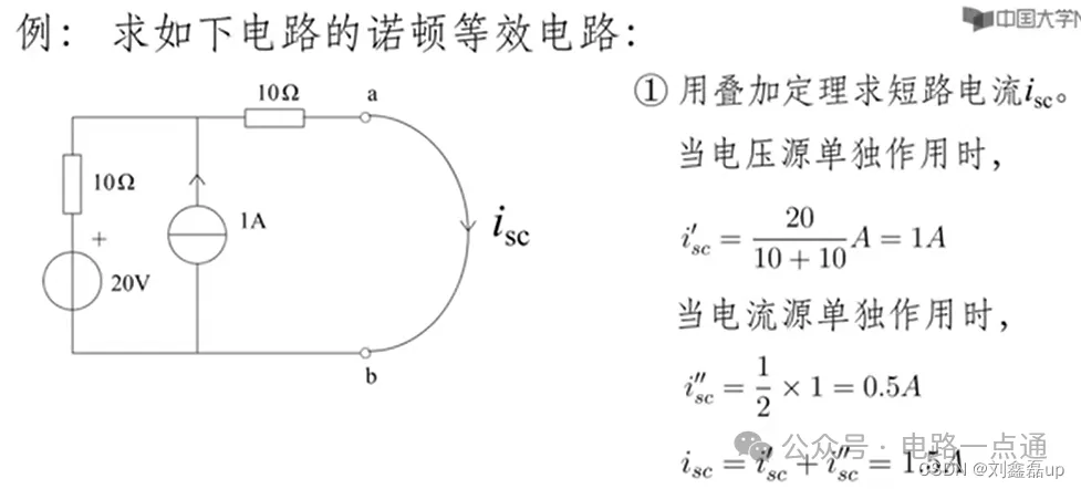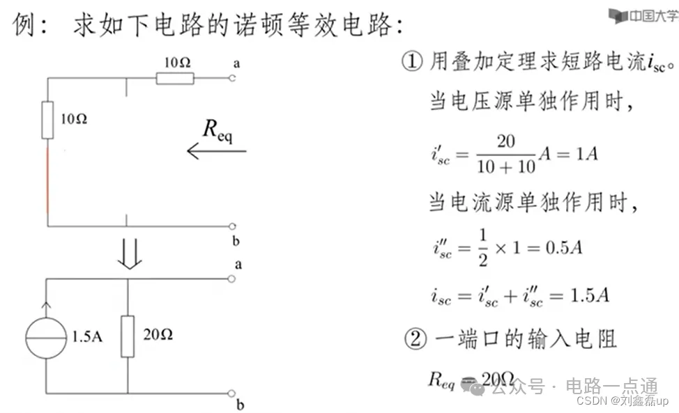 先求开路电压,再求等效电阻电流和电压并联——>替换电压 诺顿等效电路可由戴维宁等效电路经电源等效变换得到 ①若一端口网络的等效电阻R_eq=0,该一端口网络只有戴维宁等效电路,无诺顿等效电路 R=0——>U=IR=0——>无诺顿等效电路 ②若一端口网络的等效电阻R_eq=∞,该一端口网络只有诺顿等效电路,无戴维宁等效电路 R=∞——>I=0——>戴维宁等效电路