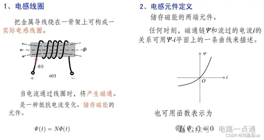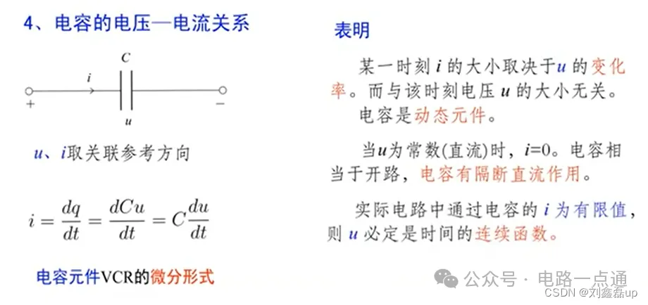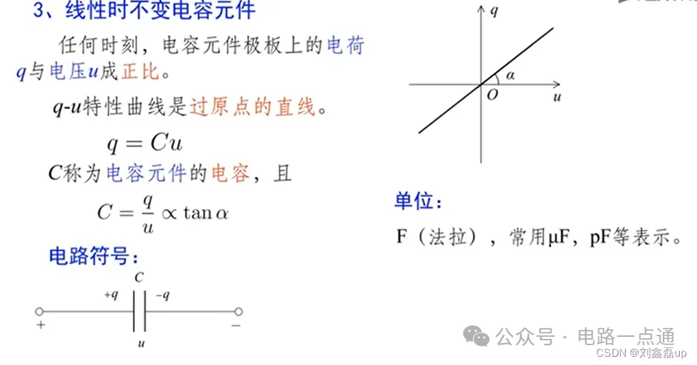 电容器:两个导体极板,中间由绝缘材料隔开,构成一个电容器 在外电源作用下,正、负电极上分别带上等量异号电荷 撤去电源,电极上的电荷仍可长久地聚集下去,是一种储存电能的元件 电容元件定义:储存电能的两端元件 任何时刻其储存的电荷q与其两端的电压u能用q-u平面,上的一条曲线来描述 函数表示:f(u,q)=0