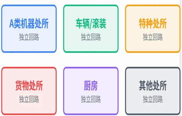 A 类机器处所、车辆处所、滚装处所、厨房、特种处所和货物处所的通风系统,原则上应相互分开,并与其他处所(如起居、服务处所)的通风系统完全独立。这是为了防止一处发生火灾时,火焰和有毒烟气通过共用通风系统迅速扩散到其他区域。