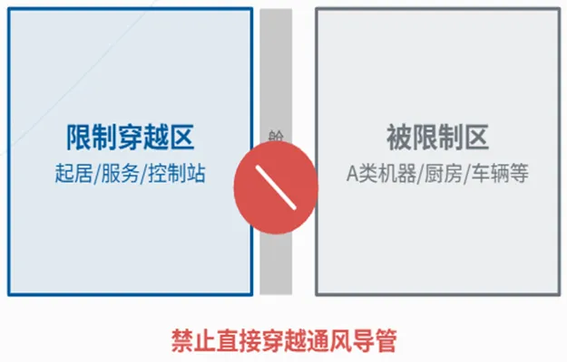 - 安全区→高风险区:反之,起居处所等的通风导管,也不应穿过 A 类机器处所、厨房等高风险区域。